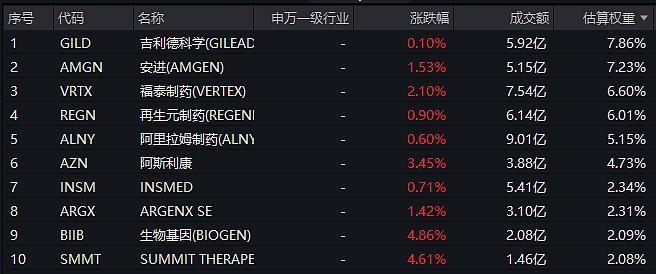 纳指生科成分股:$AMGN(AMGN)、$VRTX(VRTX)、$GILD(GILD)、$REGN(REGN)、$AZN(AZN)、$BIIB(BIIB)、$ARGX(ARGX)、$SMMT(SMMT)、$INSM(INSM)