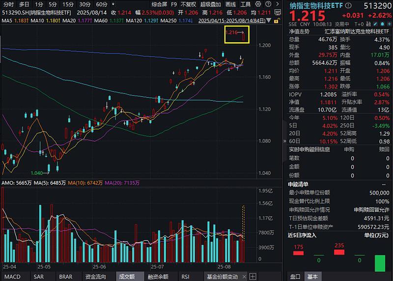 隔夜美股三大指数集体收涨,纳指生物科技指数收涨2.43%,一马当先,道指收涨1.04%,纳指收涨0.14%,标普500收涨0.32%。8月14日截至10:09,$纳指生物科技ETF(513290)上涨2.62%,交投爆量,半日成交额已逼近昨日全天。